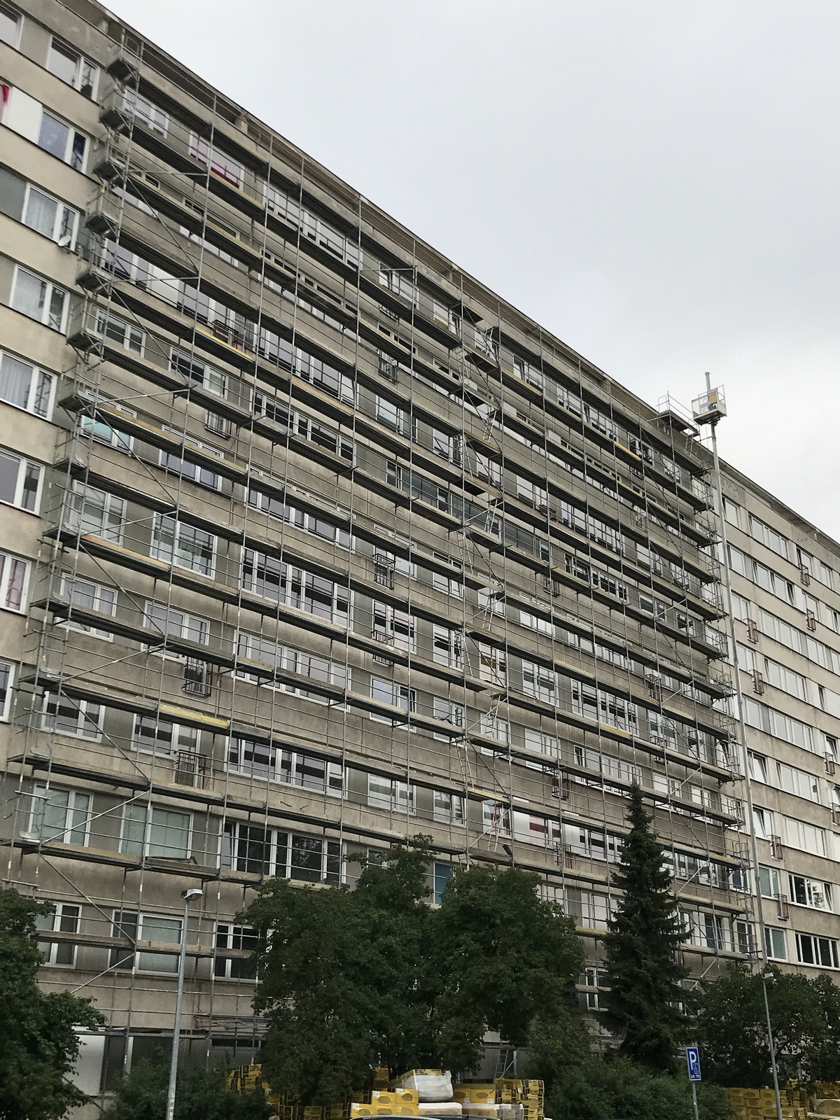 Právě probíhající hydroizolace střechy panelového bytové domu