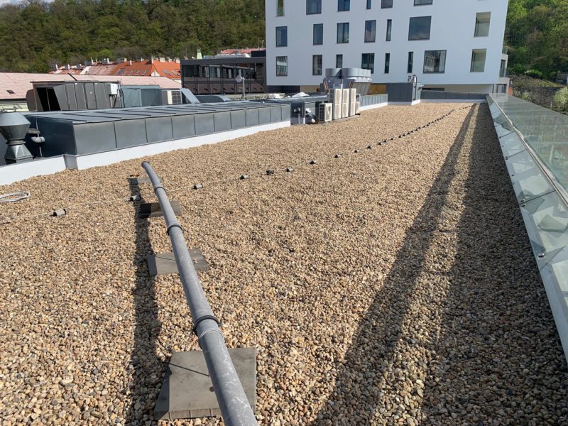 U administrativní budovy Corso Karlín jsme na jaře 2021 realizovali kompletní rekonstrukci hydroizolační vrstvy střechy o rozloze 800m2. Jako hydroizolační fólie bylo použito PVC Fatrafol 818 tl. 1,5 mm. Součástí bylo přesouvání kačírku v rámci plochy střechy po jednotlivých etapách.