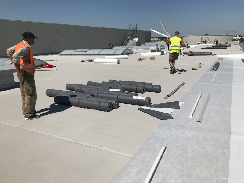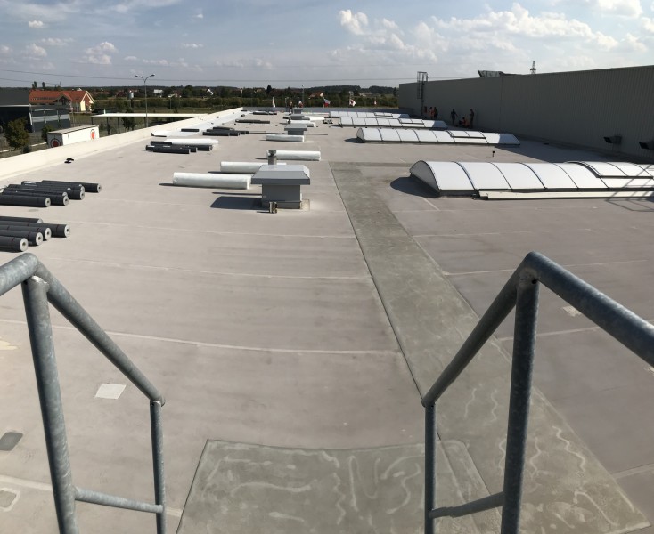 Pro výrobní halu v Kolíně o velikosti 2000 m2 provádíme rekonstrukci střechy. Aktuálně pokládáme novou hydroizolační vrstvu z hydroizolační fólie Sikaplan 15.